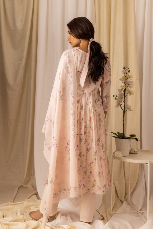 Floral Printed Pleated Style A-Line Kurta With Trousers & Dupatta