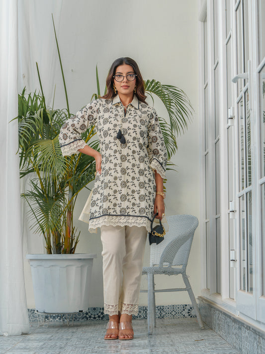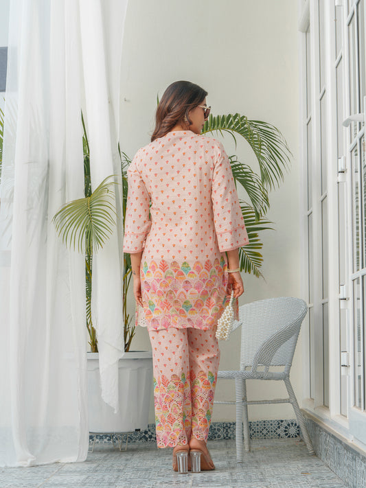 Floral Printed Mandarin Collar Pure Cotton Tunic With Trouser