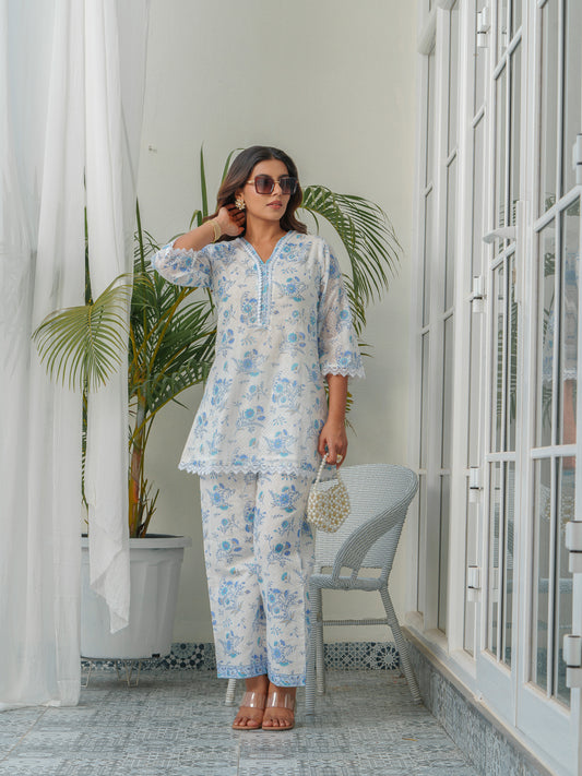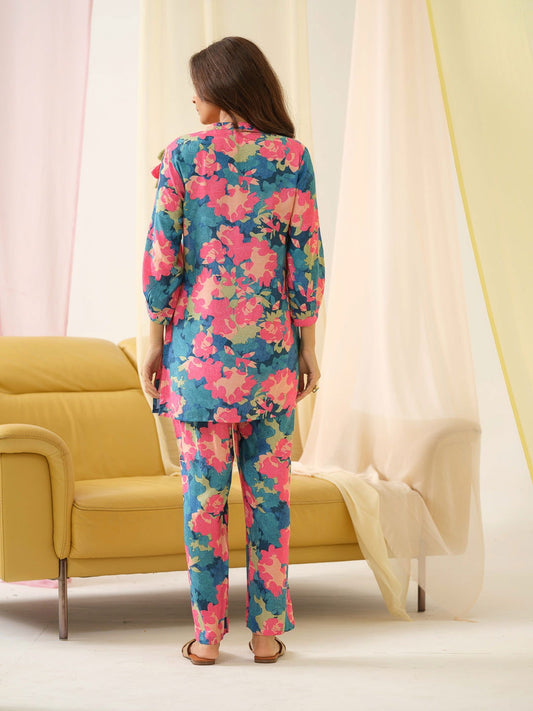 Floral Printed Pure Cotton Shirt Collar Neck Tunic & Trousers