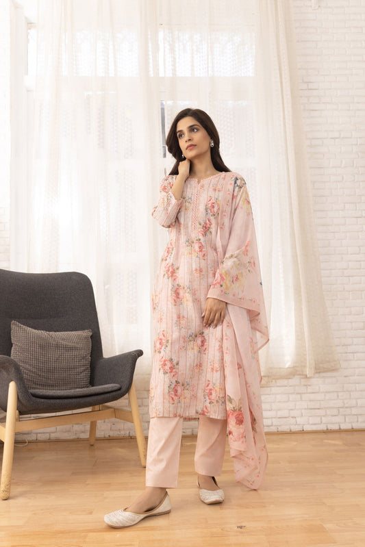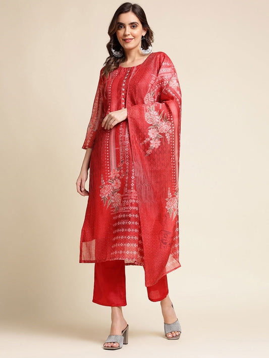 Floral Printed Round Neck Straight Kurta With Trousers & Dupatta