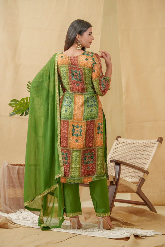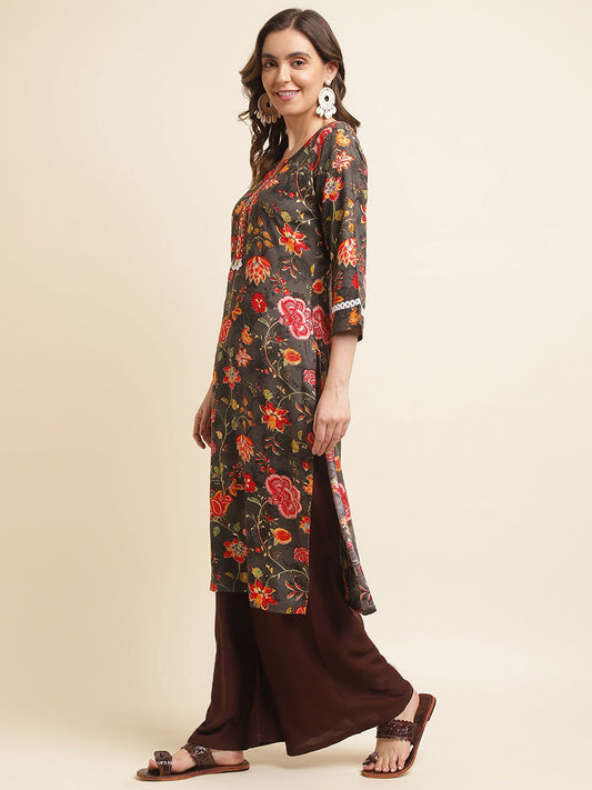 Floral Printed Notch Neck Straight Kurta With Trousers & Dupatta