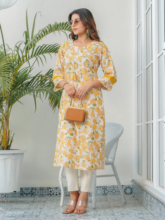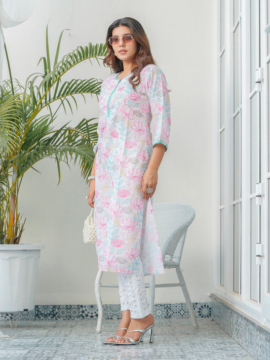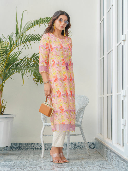 You save 48%Floral Printed Round Neck Linen Straight Kurta