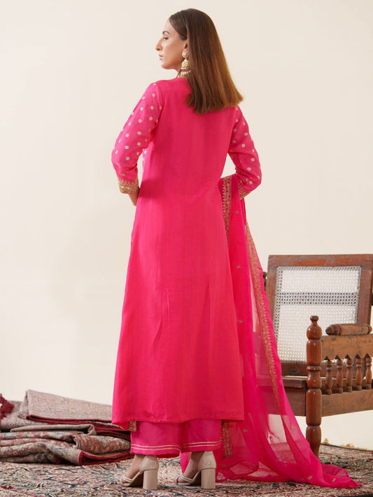 Glass Silk Pink Color Embroidered Kurta With Trousers & Dupatta