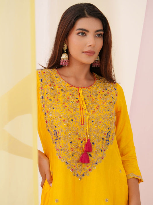 Glass Silk Yellow Color Embroidered Kurta With Trousers & Dupatta
