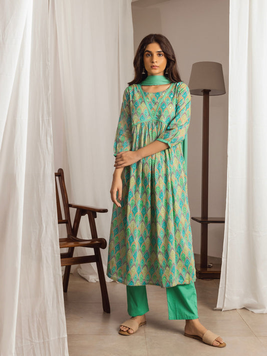 Green Bandhani Printed A-Line Kurta and Trousers With Dupatta