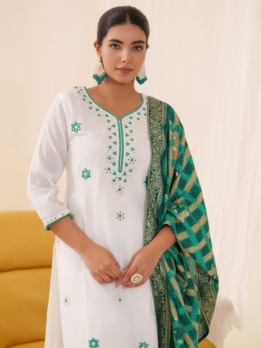 You save 70%Glass Silk Embroidered Kurta With Trousers & Dupatta