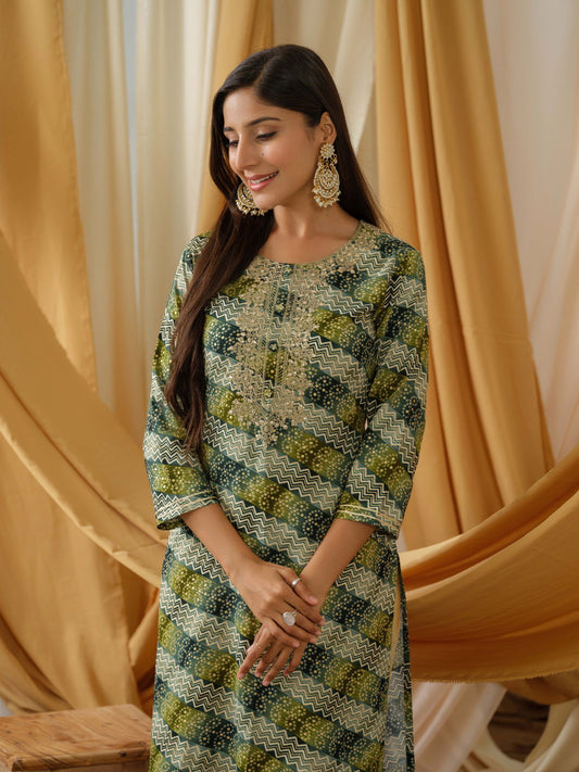 You save 74%Green Bandhani Printed Round Neck Straight Kurta