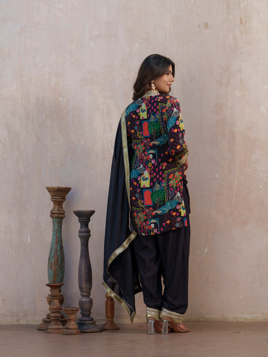 Black Floral Embroidered Kurta & Trousers With Dupatta
