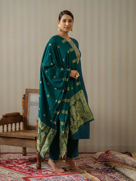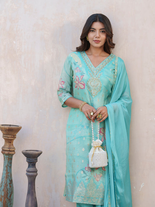 Blue Embroidered Woven Design Straight Kurta and Trousers With Dupatta