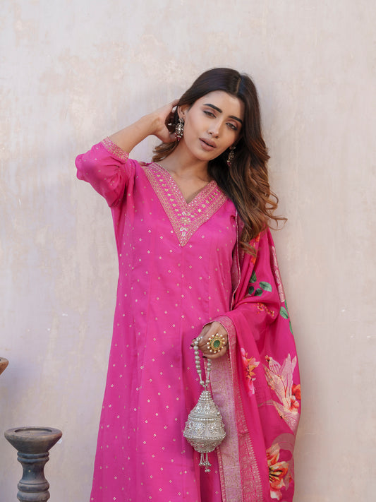 Bandhani Printed V-Neck Straight Kurta With Trouser & Dupatta