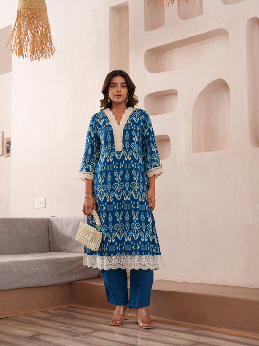 Blue Ethnic Motif Printed V-Neck Straight Kurta With Trousers