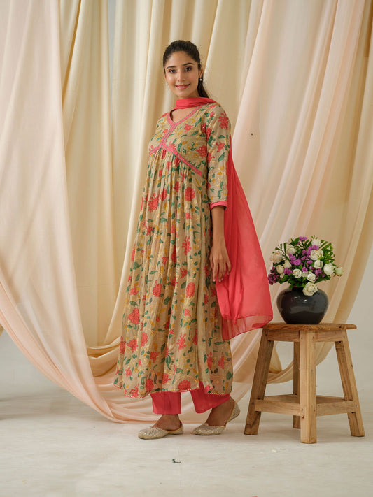 Beige Floral Printed Sequinned Empire Pure Cotton Kurta With Trouser & Dupatta