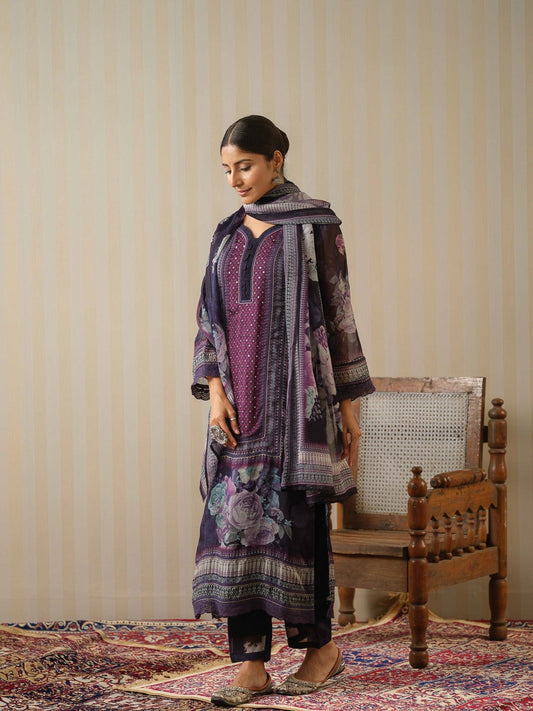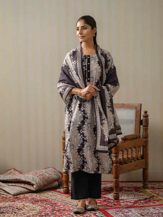 Black Printed Floral Straight Kurta and Trousers With Dupatta