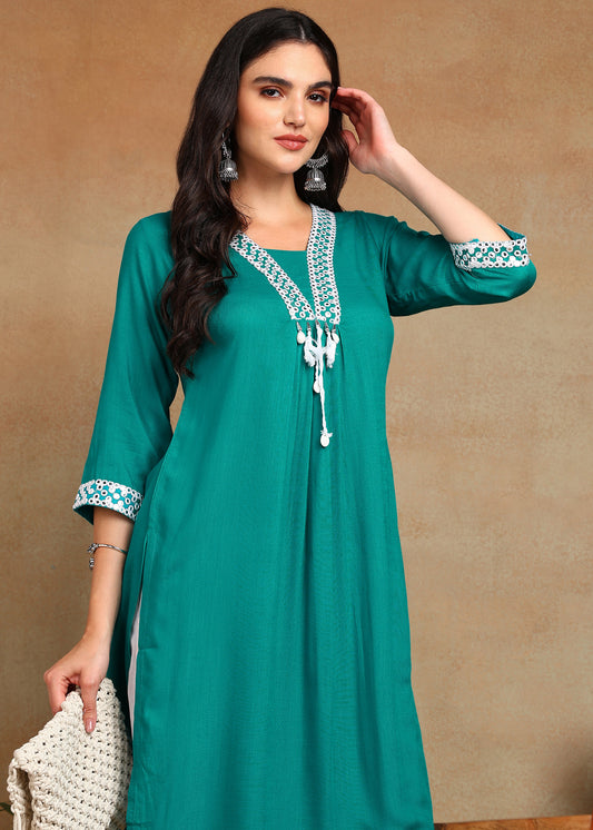 Teal Rayon Slub Kurti with White Embroidered Lace Detailing