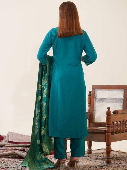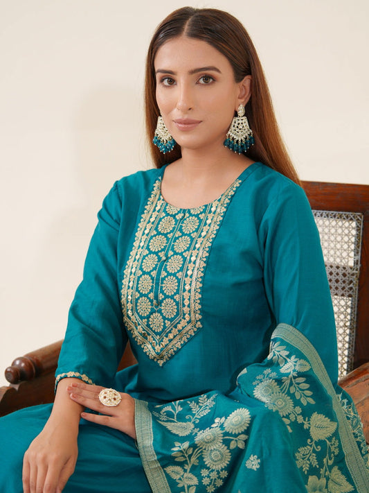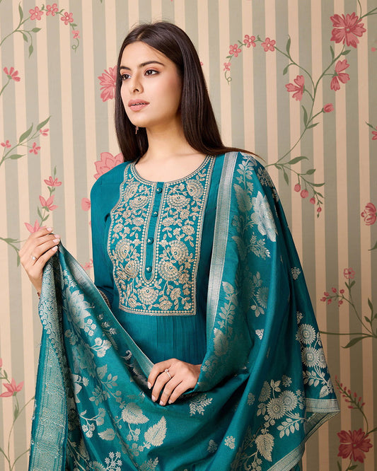 Teal Woven Design Yoke Design Straight Kurta Trousers With Dupatta