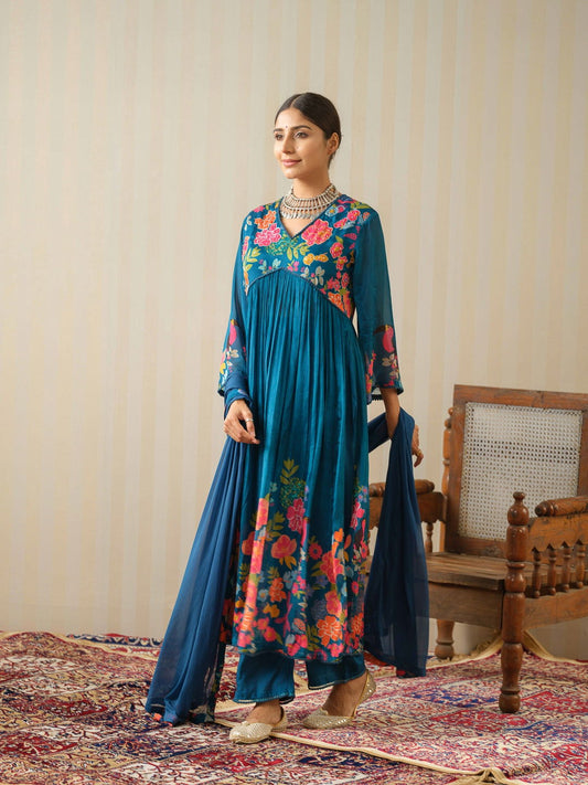 Turquoise Blue Floral Printed Flared A-Line Kurta With Trouser & Dupatta