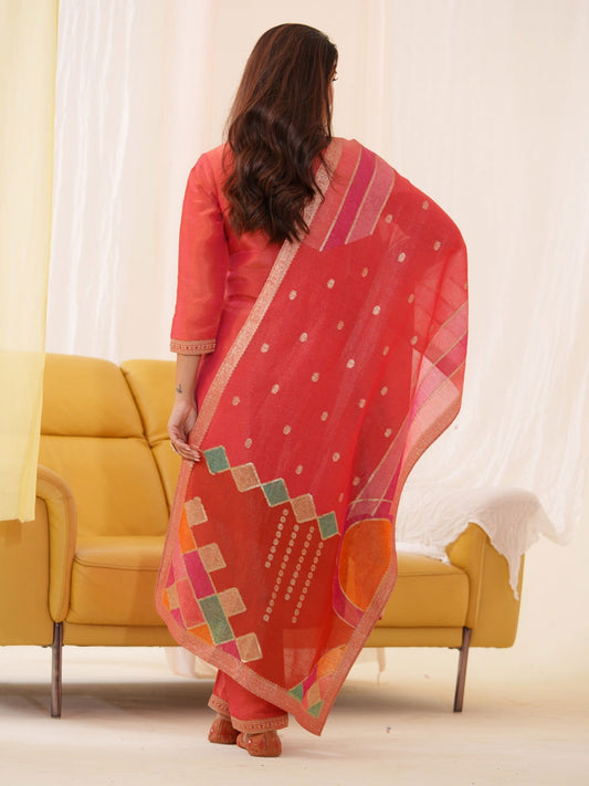 Tomato Chiffon Women Ethnic Motifs Embroidered Kurta With Trousers & Dupatta