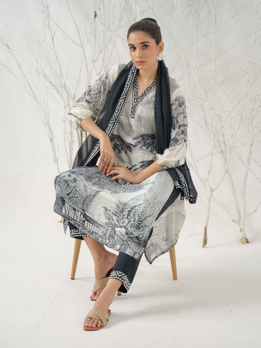 Tribal Printed Straight Linen Kurta With Trousers & Dupatta