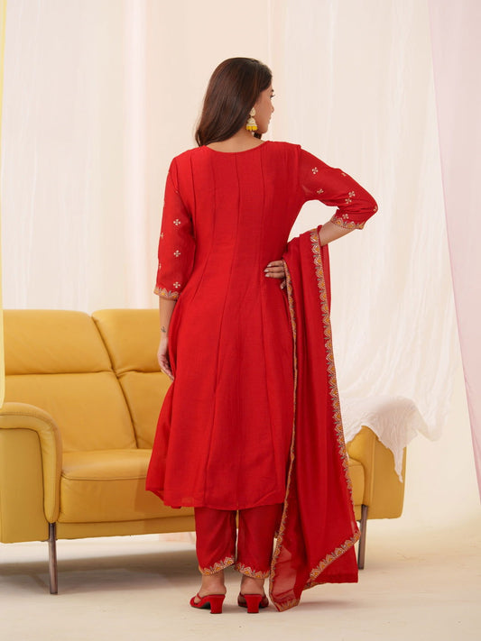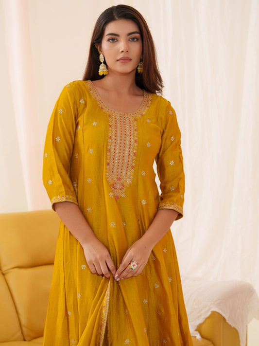 Vichitra Rama Floral Embroidered A-Line Kurta With Trousers & Dupatta