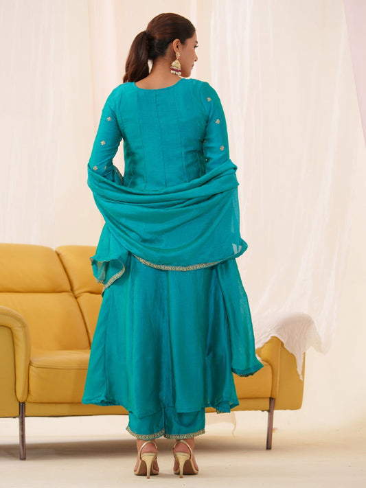 Teal Embroidered Calf Length Festive Kurti and Trousers With Dupatta