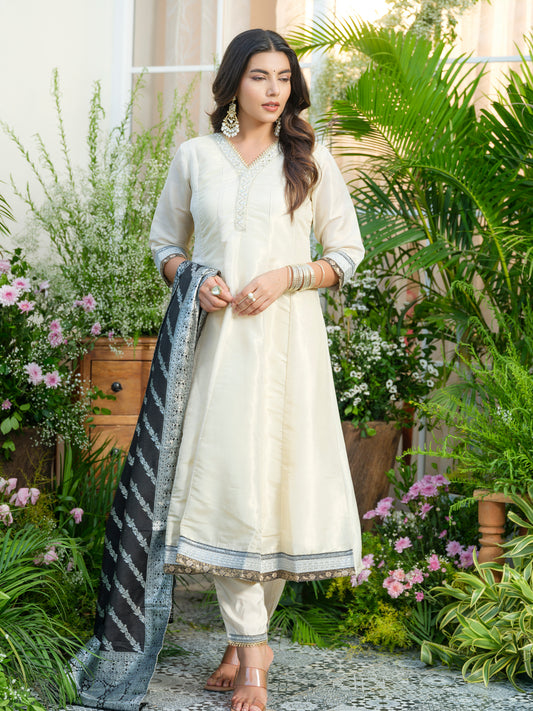 White Embroidered Neckline A line Kurta with Trouser and Black Printed Dupatta