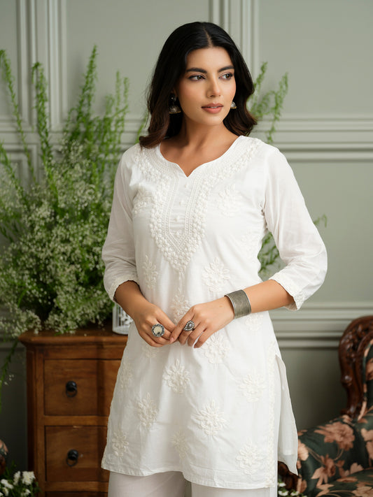 White Embroidered Cotton Co-ord Set with Kurta & Wide-Leg Pants