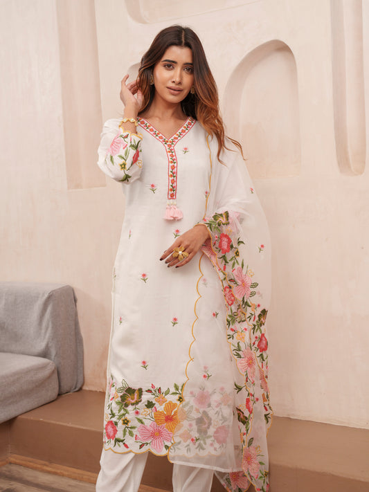 White Floral Embroidered Poly Chanderi V-Neck Kurta With Trousers And Dupatta