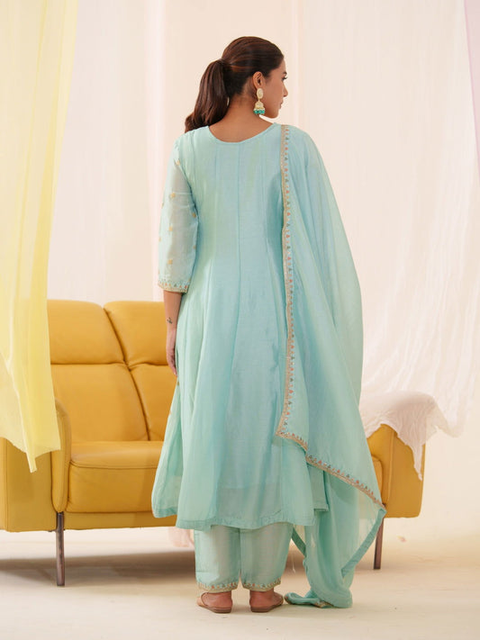 Vichitra Sky-Blue Color Floral Embroidered Anarkali Kurta With Trousers & Dupatta