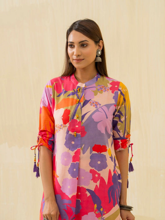 Violet & Pink Floral Printed Mandarin Collar Kurta With Trousers