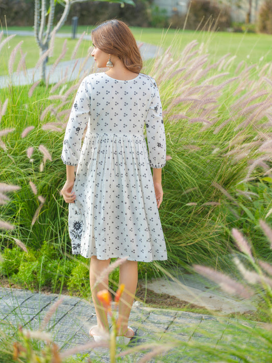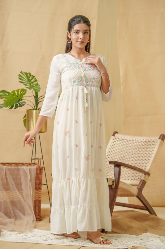 You save 76%White Floral Embroidered V-Neck A-Line Ethnic Dress