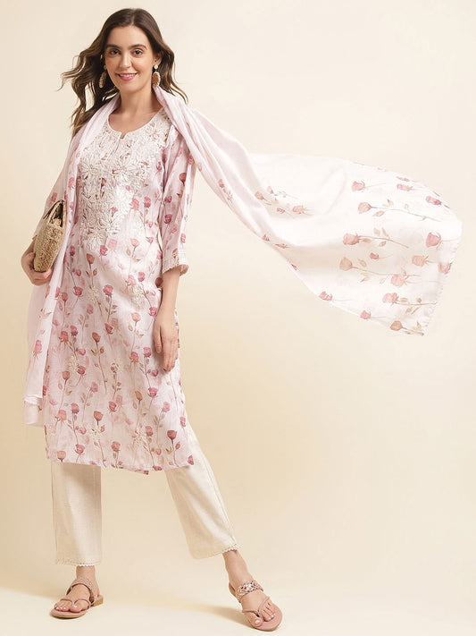White Floral Printed Thread Work Linen Kurta Trousers & Dupatta