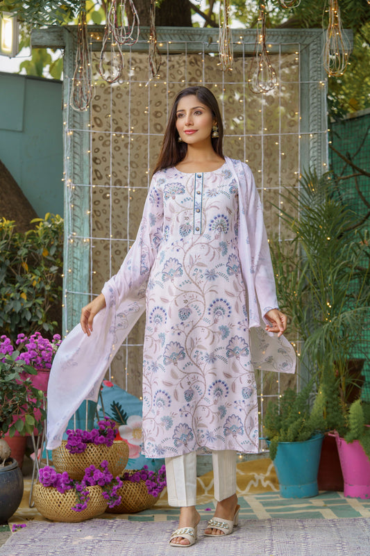 White & Purple Floral Printed Straight Kurta With Trousers and Dupatta
