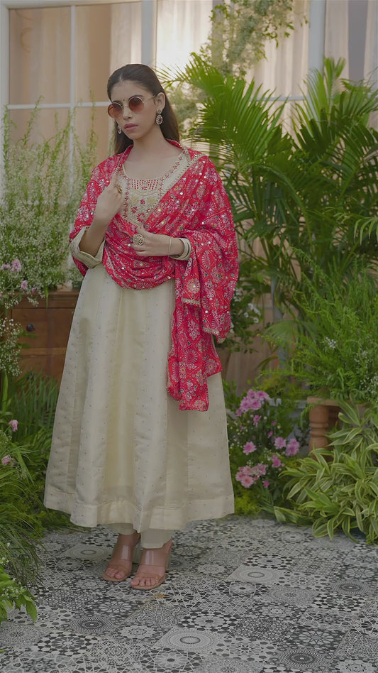 White Embroidered Neckline A line Kurta with Trouser and Red Printed Dupatta