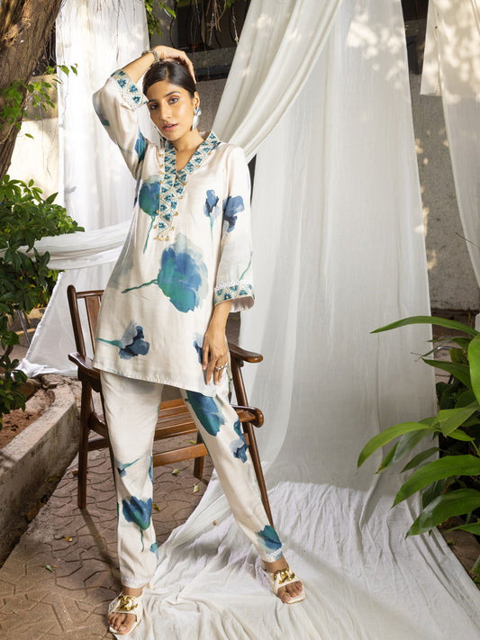 You save 64%White Floral Printed Poly Muslin Top & Trouser