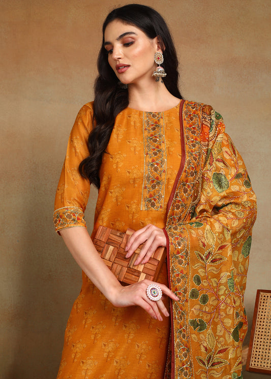 Women's Mustard Ethnic Motif Printed Kurta with Kantha & Sequin Work, Paired with Trousers and Dupatta