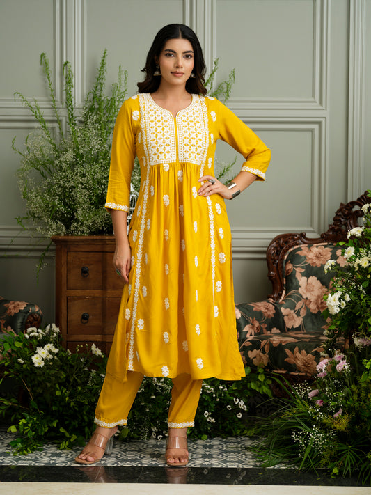 Women's Mustard Hand Chikankari embroidery A-Line Kurta with Pant
