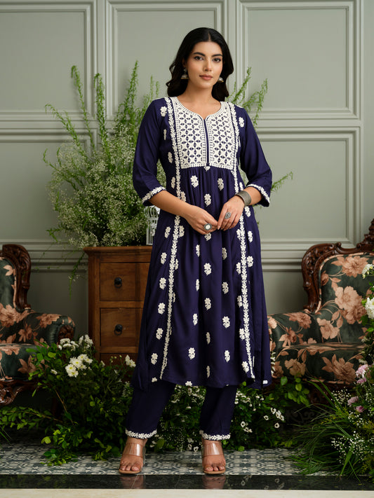 Women's Navy Blue Hand Chikankari embroidery A-Line Kurta With Pant