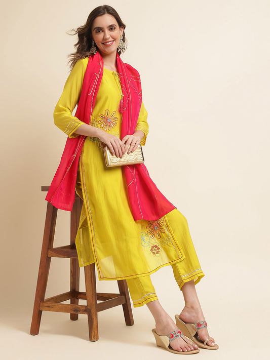 Women Yellow & Pink Floral Embroidered Sequinned Kurta With Trousers & Dupatta