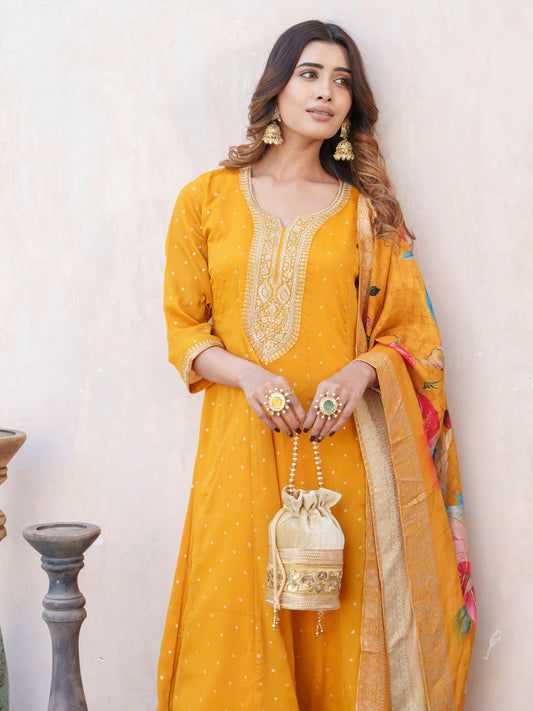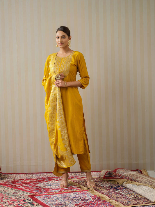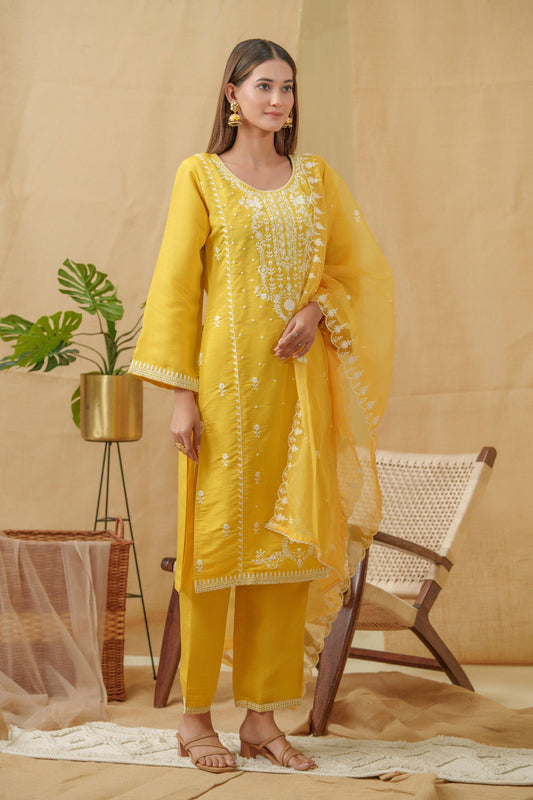 Yellow Thread Work Pure Silk Straight Kurta & Trouser With Dupatta