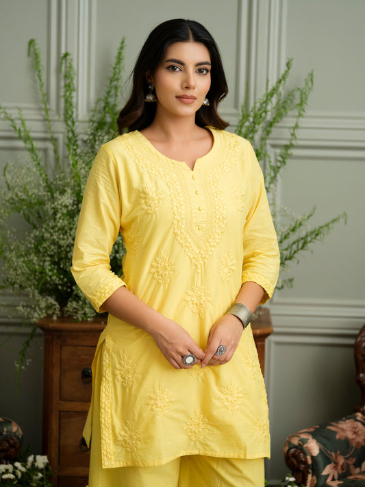 Yellow Embroidered Cotton Co-ord Set with Kurta & Wide-Leg Pants