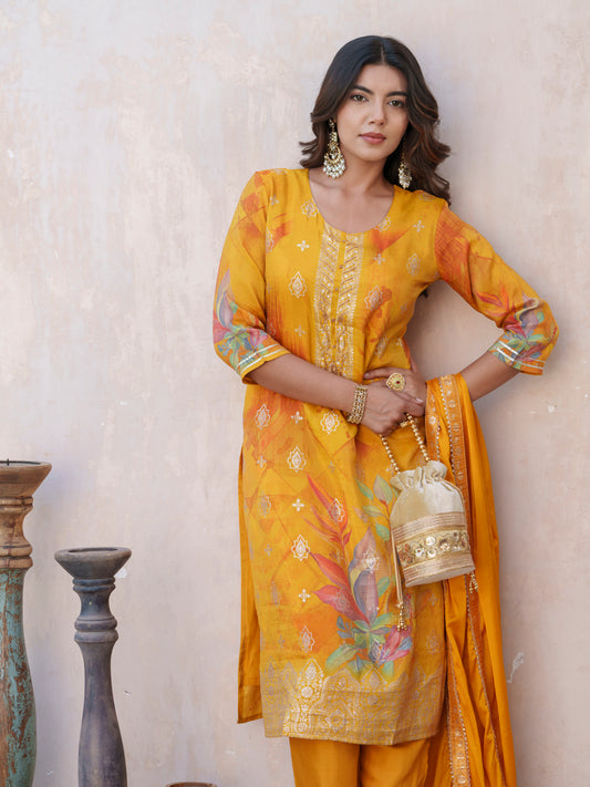 Yellow Floral Printed Straight Kurta With Trousers And Dupatta