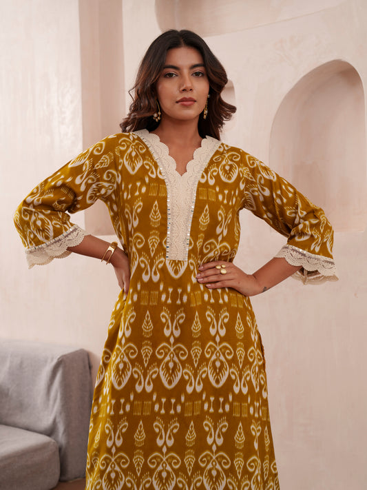 Yellow Rayon Slub Kurti with White Embroidered Lace Detailing