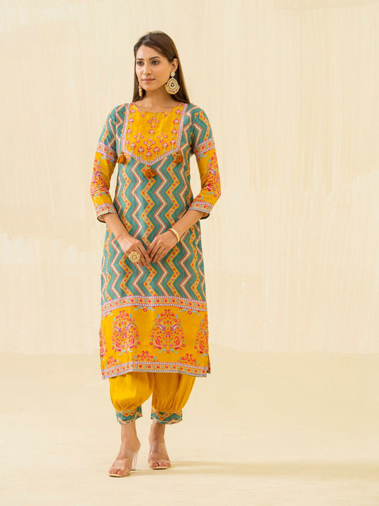 Yellow Chevron Printed Beads and Stones Straight Kurta With Salwar