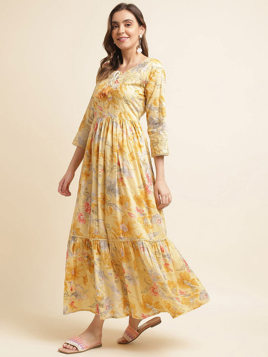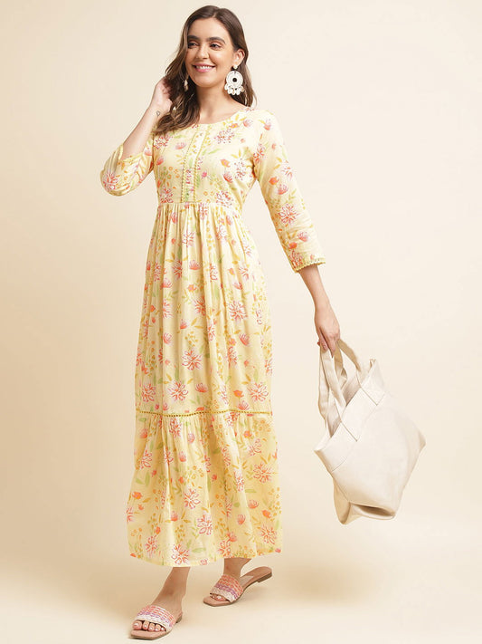 Yellow Flared Embroidered Empire Ethnic Dresses