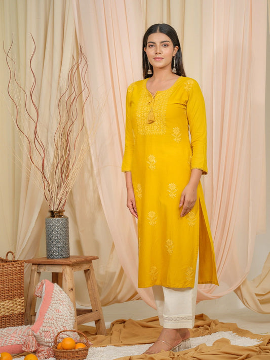 Yellow Floral Embroidered Tie-Up Neck Straight Kurtas