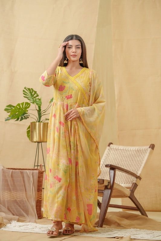Yellow Floral Printed Angrakha A-Line Kurta With Palazzos & Dupatta