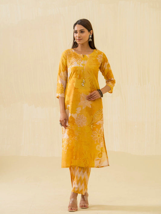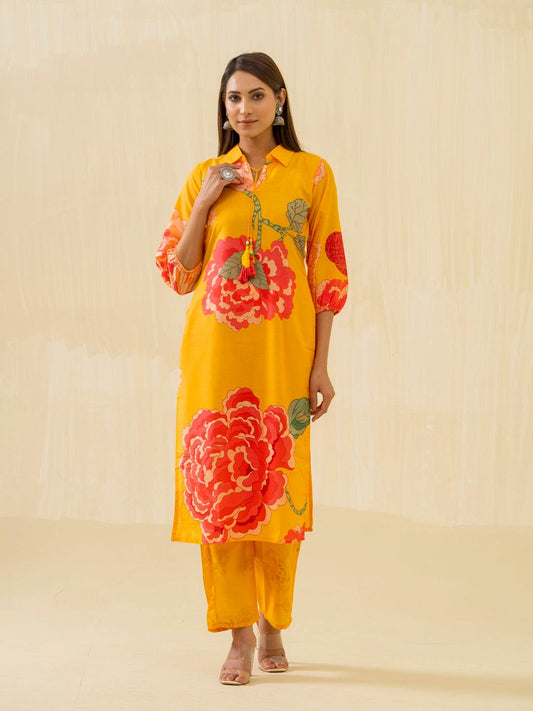 Yellow Floral Printed Shirt Collar Straight Kurta & Trouser