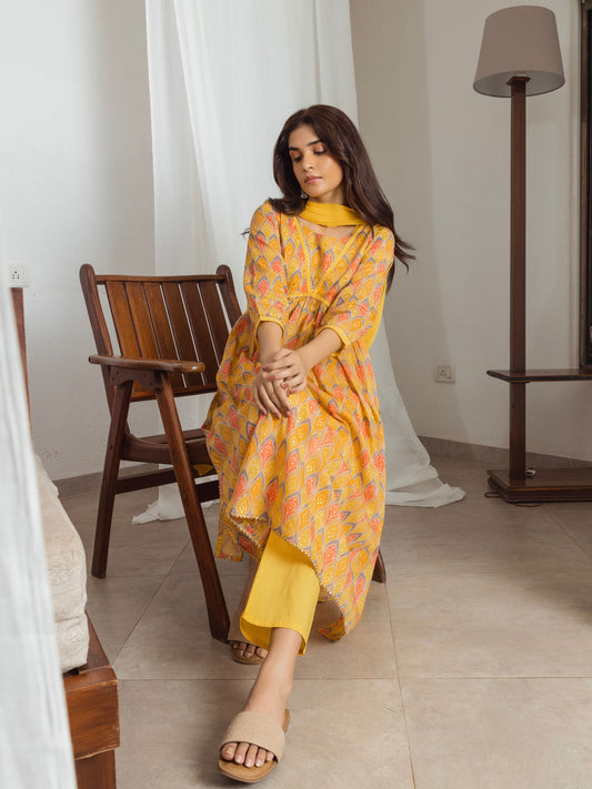 Yellow & Pink Ethnic Motifs Printed Pure Cotton Kurta & Trousers With Dupattatifs Printed Pure Cotton Kurta & Trousers With Dupatta