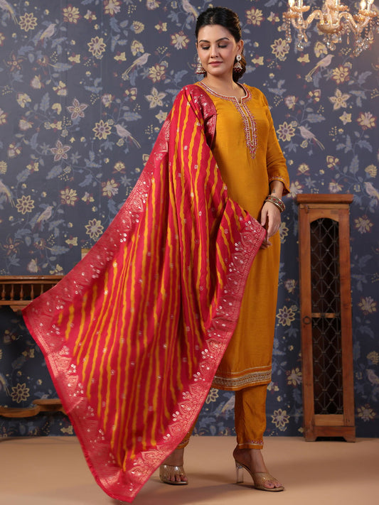 Yellow Ethnic Motifs Straight Kurta & Trousers With Dupatta