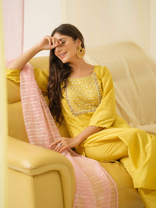 Yellow V-Neck Handwork with Sequence Touch Co-Ord Set